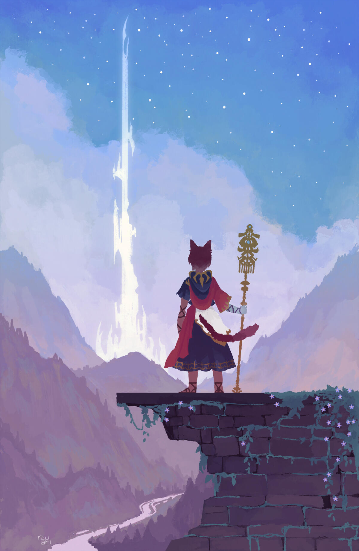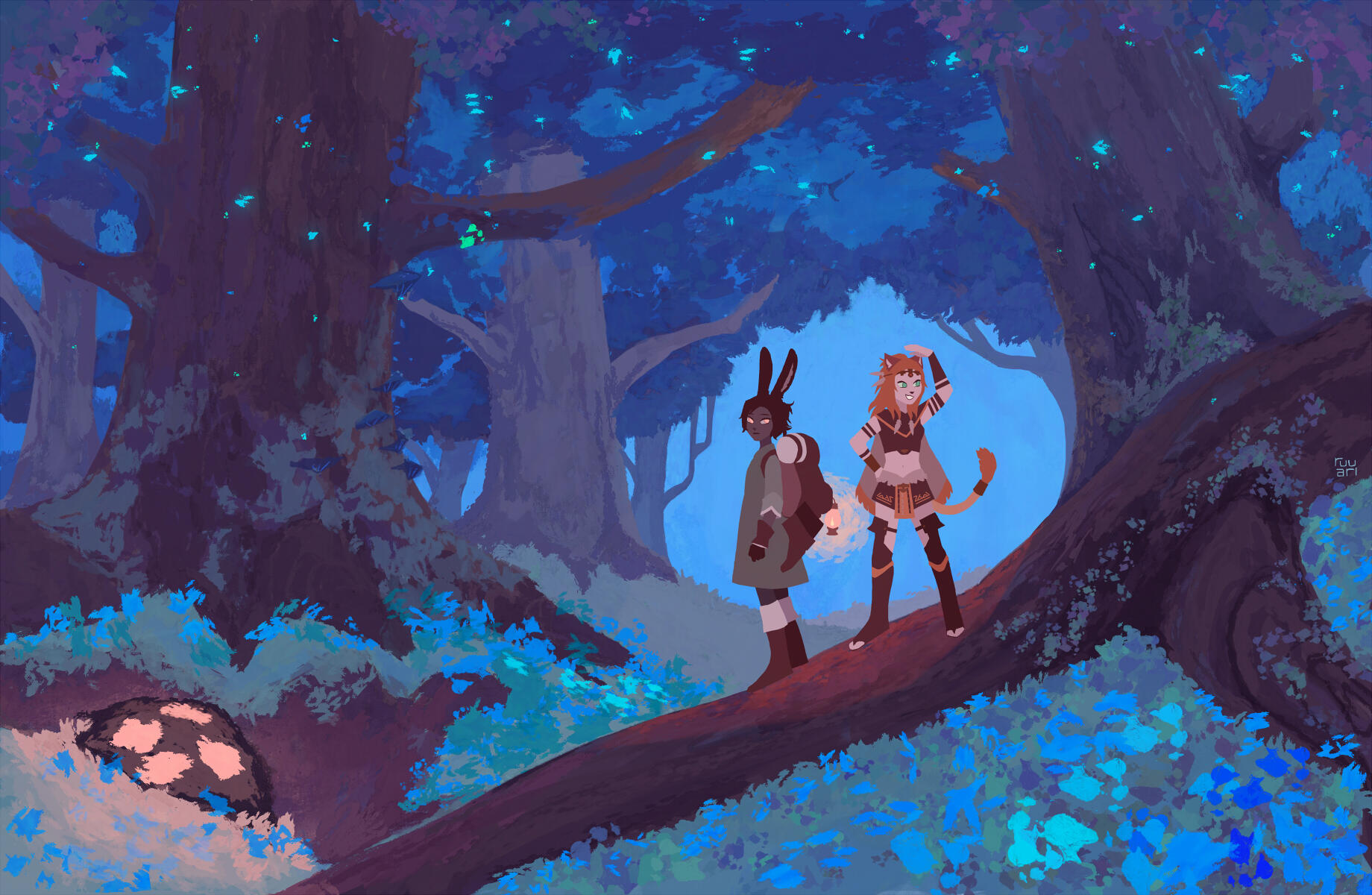 Loris and Indri under the moonlight by a river in a forest. The scenery of the Val d'Arzino, a valley in Friuli full of rivers, caves, and waterfalls, was used as reference.