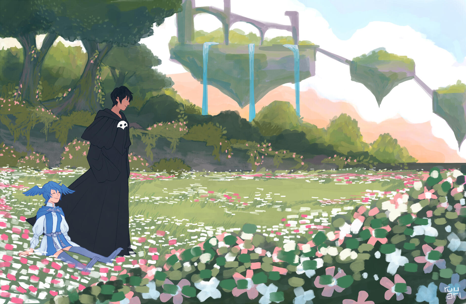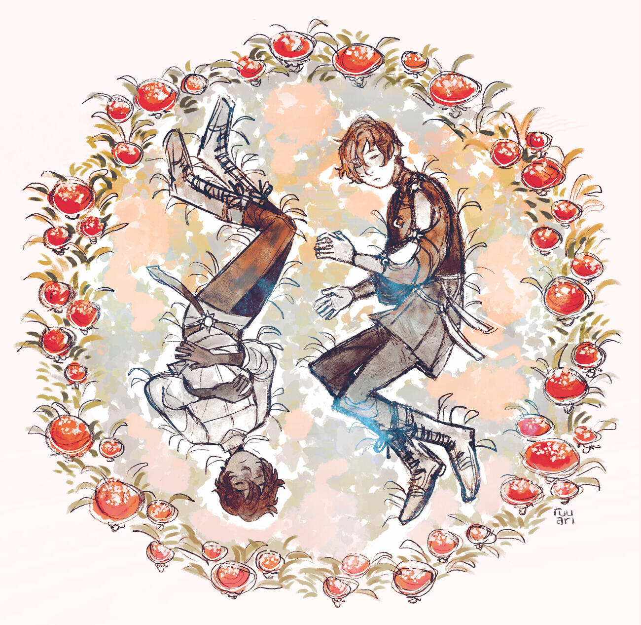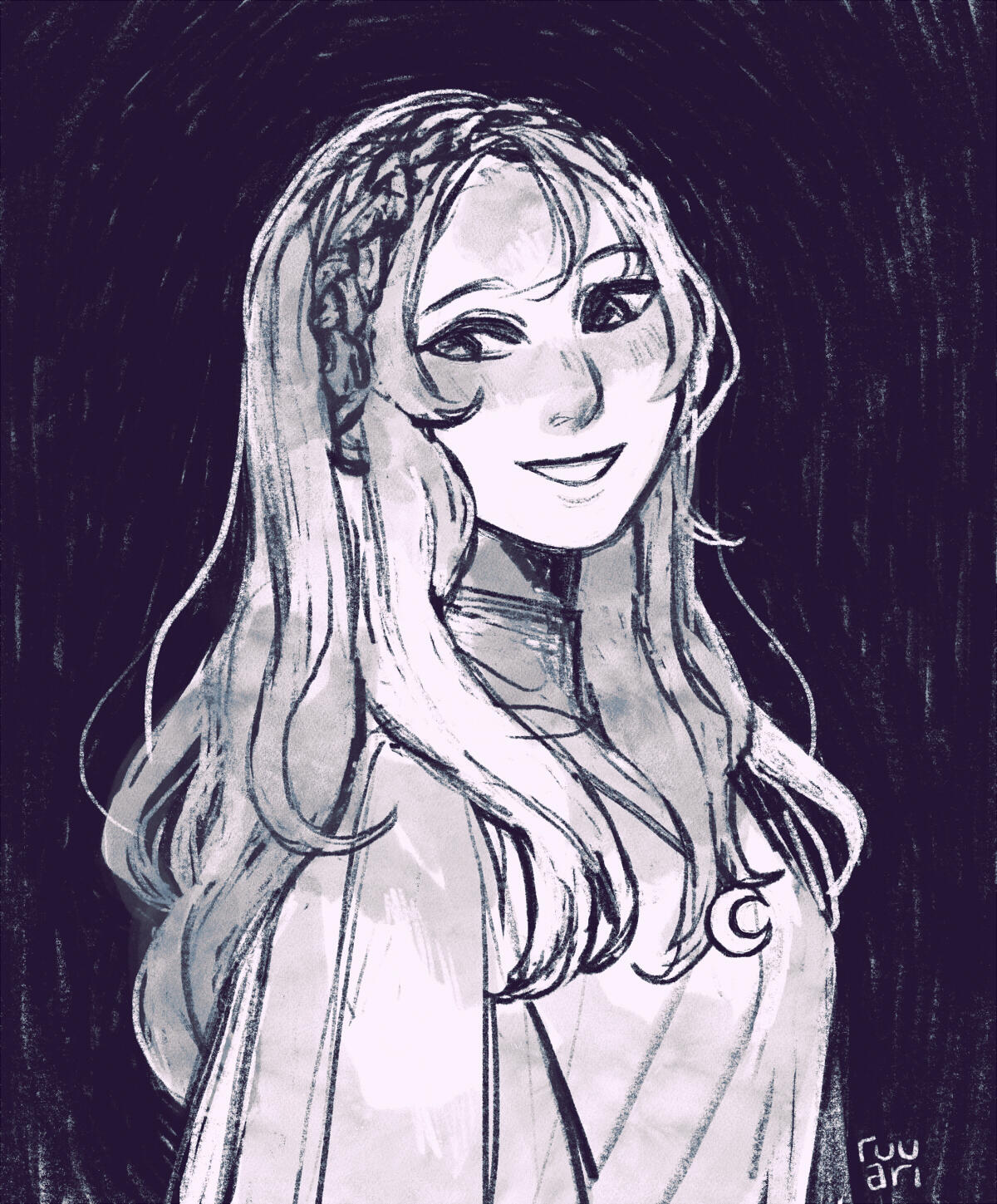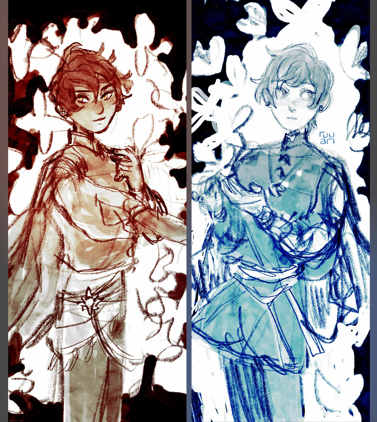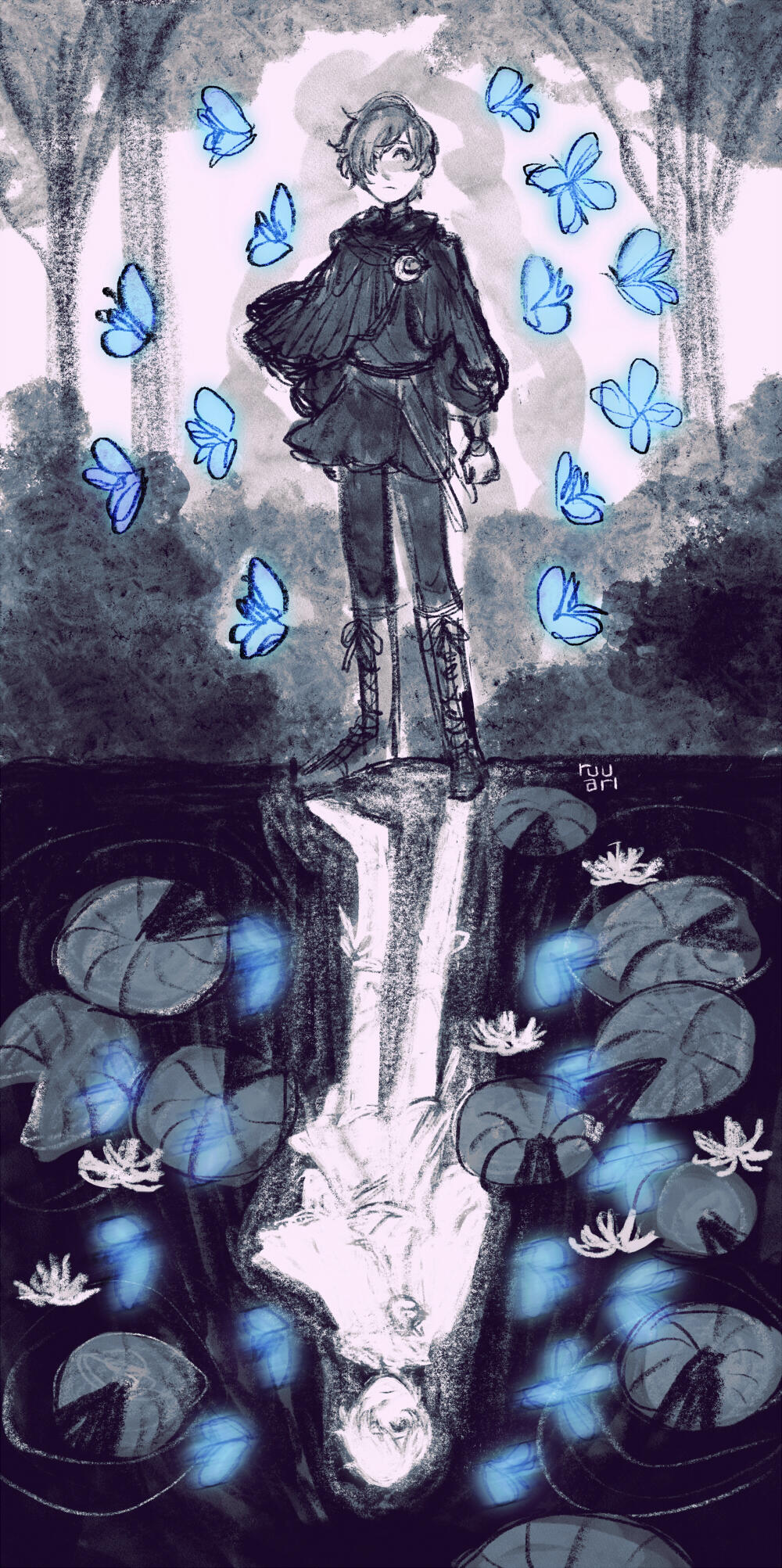 Indri, submerged in water beneath lilypads (inspired by Ophelia from Hamlet), symbolizing his water magic and ties to the agane. The blue butterflies represent his powers over dream and sleep.